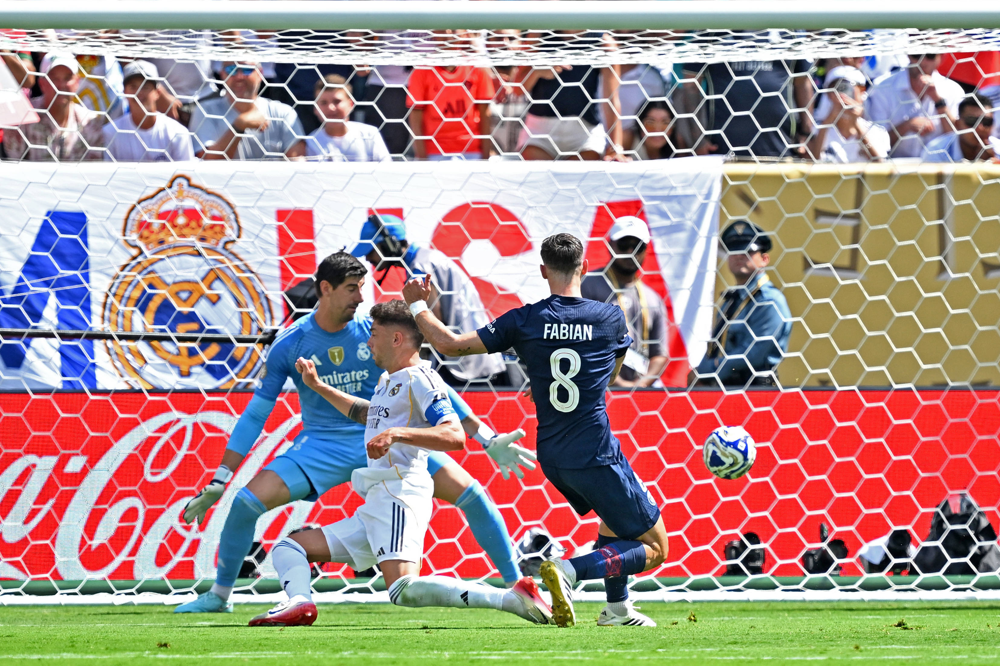 仅仅经过24分钟,登贝莱又送出一脚直塞,打穿了皇马的防线,阿什拉夫助攻鲁伊斯再添一分,比分瞬间变为3比0……上半场还没过半,皇马已惨遭对手连入三球,如同被凌虐一般,连……迈阿密国际都不如。大巴黎趁势而上,踢得越来越放松,贡萨洛悠闲自得地上演马赛回旋,随后抽射得手,最终将比分锁定为4比0。